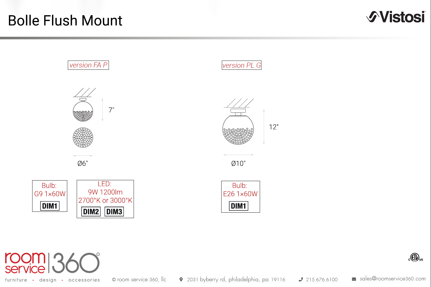- Bulb: G9 1×60W or E2 61×60W, LED: 9W 1200lm (2700°K or 3000°K)
